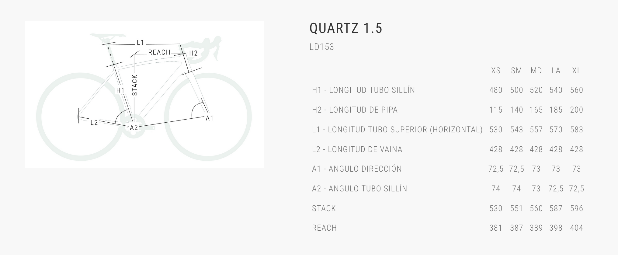 BH QUARTZ 1.5 con un nuevo cuadro de Aluminio y, horquilla de carbono, se ha diseñado con un cableado interno y equipada con el grupo Shimano 105, frenos de disco hidraúlicos, y juego de ruedas Shimano con ejes pasantes.