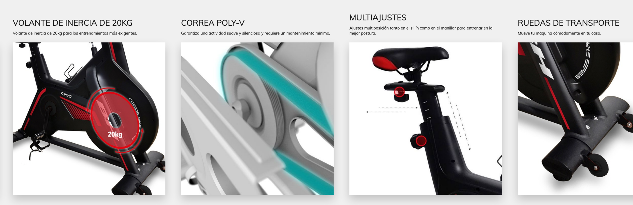 Bicicleta de Ciclo Indoor-Spinning BH TOKYO con estructura súper reforzada, volante de inercia de 20 kg y pedales mixtos automáticos.