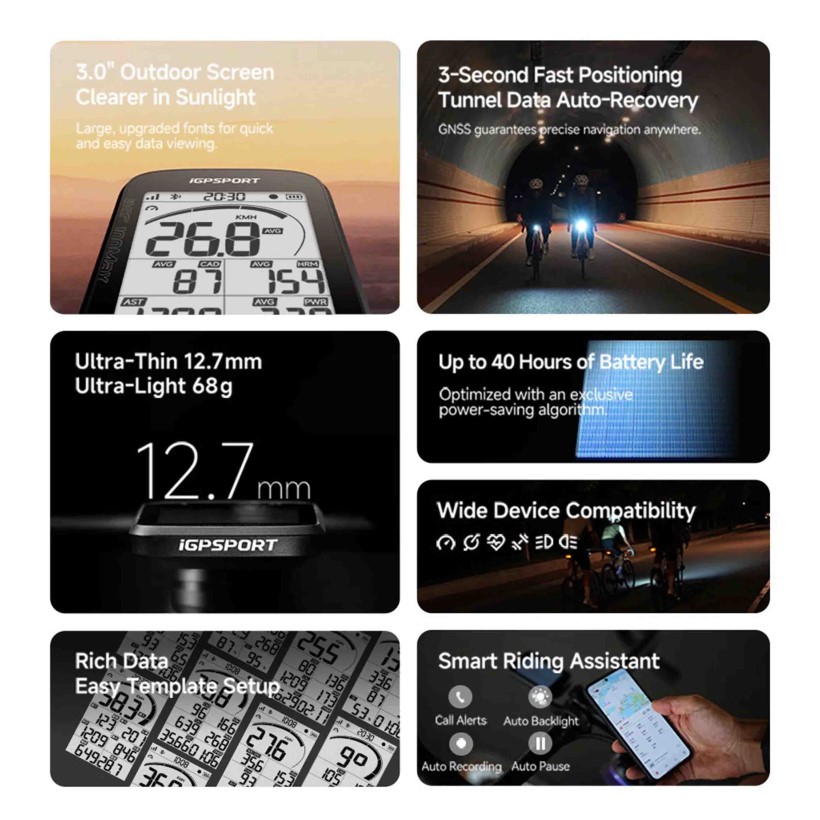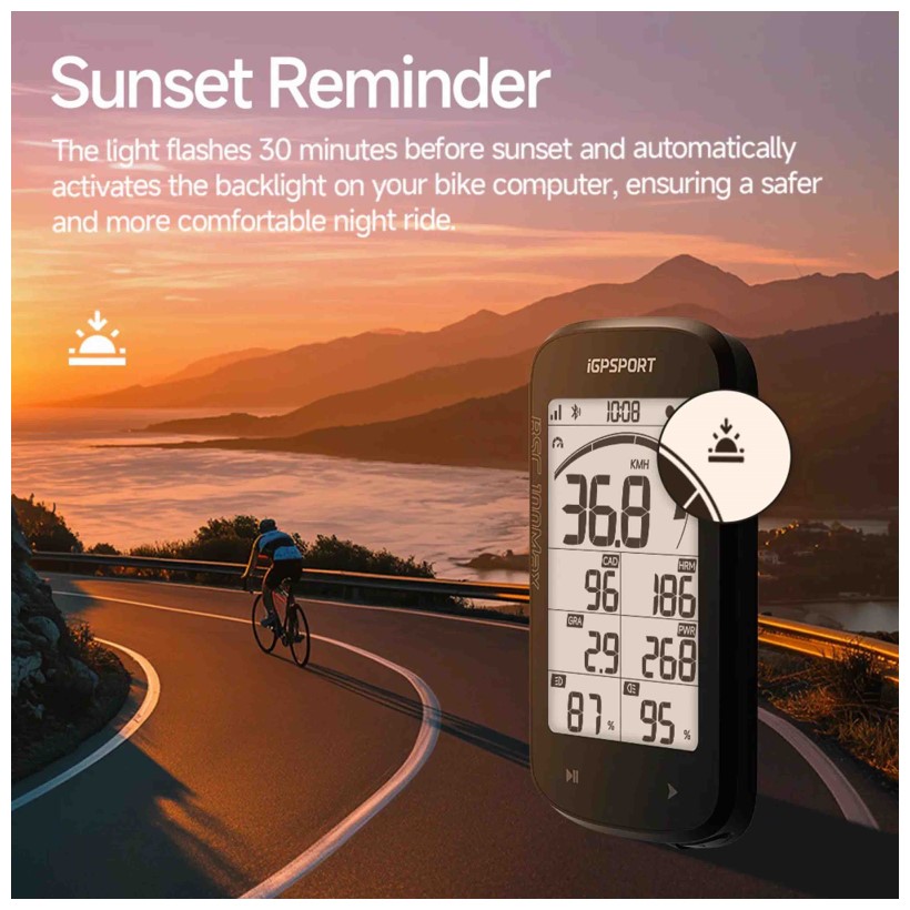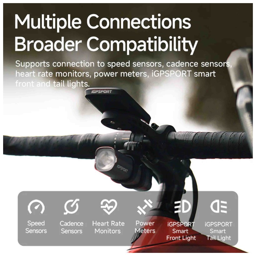 En cuanto a posicionamiento, incorpora FULL GNSS junto con soporte para efemérides AGPS. El equipo es compatible mediante bluettoth con sensores externos de velocidad, cadencia, frecuencia cardíaca y medidores de potencia. También admite luces inteligentes.